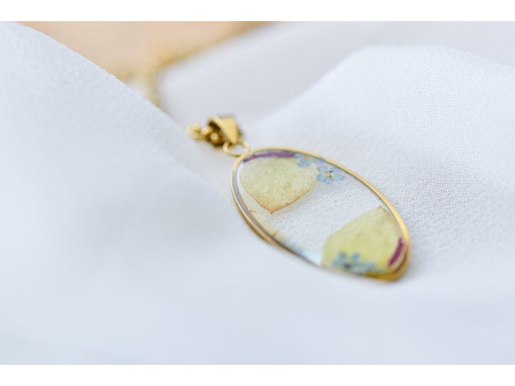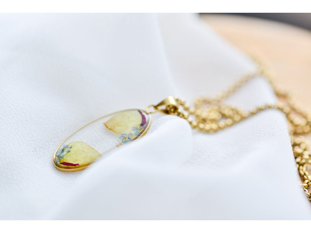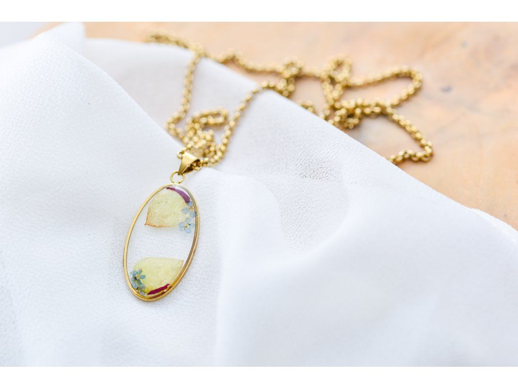 Květinový oválný přívěsek z kvalitní chirurgické oceli vyrobené v ČR ve zlatém provedení.